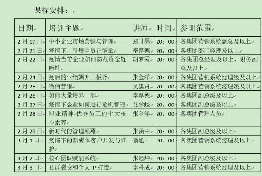 此外,还专门制定了培训计划表,每天固定时间进行网络直播培训。培训内容即包括防护知识的培训,又包含疫情期间心理健康的培训,同时进行各方面职业素养的培训。在这个超长假期,不仅提升了员工防护知识,为复工做好了防护准备,还提升了员工职业素养,修炼了企业内功,为复工后迅速发展攒足了能量。